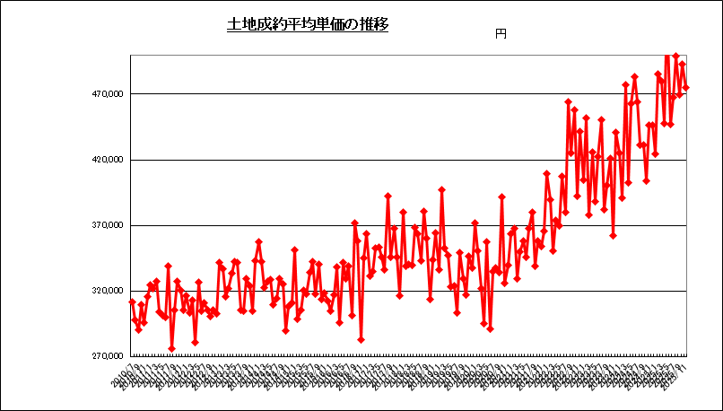 成約㎡単価は、425,000円で、前月比は-8.5前年同月比は+25.4%でした。