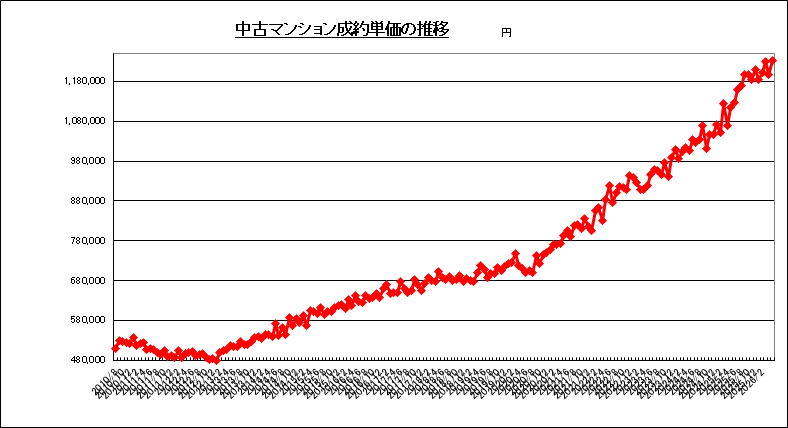 成約㎡単価は、1,210,600円で、前月比は+15.7%、前年同月比は+2.2%でした。
