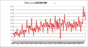 2022年9月発表、東京都の中古マンション成約件数は1,587件で、前月比+29.3%、前年同月比で-1.4%でした。前月比で30%近いプラス、前年同月比ではややマイナスになりました。先月の成約件数のマイナス分を今月は補った数字になりました。